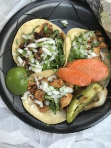 Next up we had the spicy pork taco, which was just as tender at the chopped chicken. It was topped with both types of onions, cilantro, and the usual spicy sauce. The taco was a little messy, as we’ve dealt with before, but definitely worth getting your hands dirty. We also tried our first BBQ taco. Our only complaint with the BBQ taco was that the meat had a little bit of extra fattiness that could’ve been trimmed before serving. The plate itself was garnished with lime, carrots, grilled onions and a grilled jalapeno, which was one of the snazziest presentations so far!
